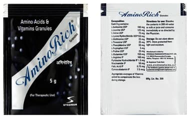 Aminorich Syrup contains Cyanocobalamin, L-arginine, L-isoleucine, L-leucine, L- lysine, Methionine, Niacinamide, Tryptophan, Isoleucine, Iron, Zinc and Folic acid.