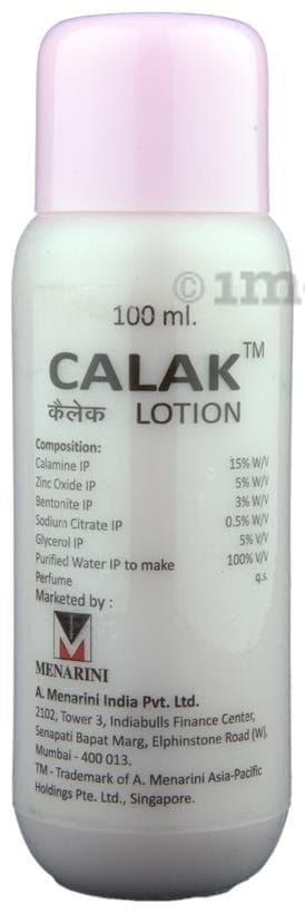 Calak Lotion contains Bentonite, Sodium citrate, Calamine, Glycerol and Zinc oxide as main active ingredients. The formulation is used for minor skin infections, itching, and other skin related problems.