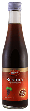 Dabur Restora Syrup contains a blend of Grapes, Honey, Cinnamon, Nutmeg, and Clove as major ingredients.